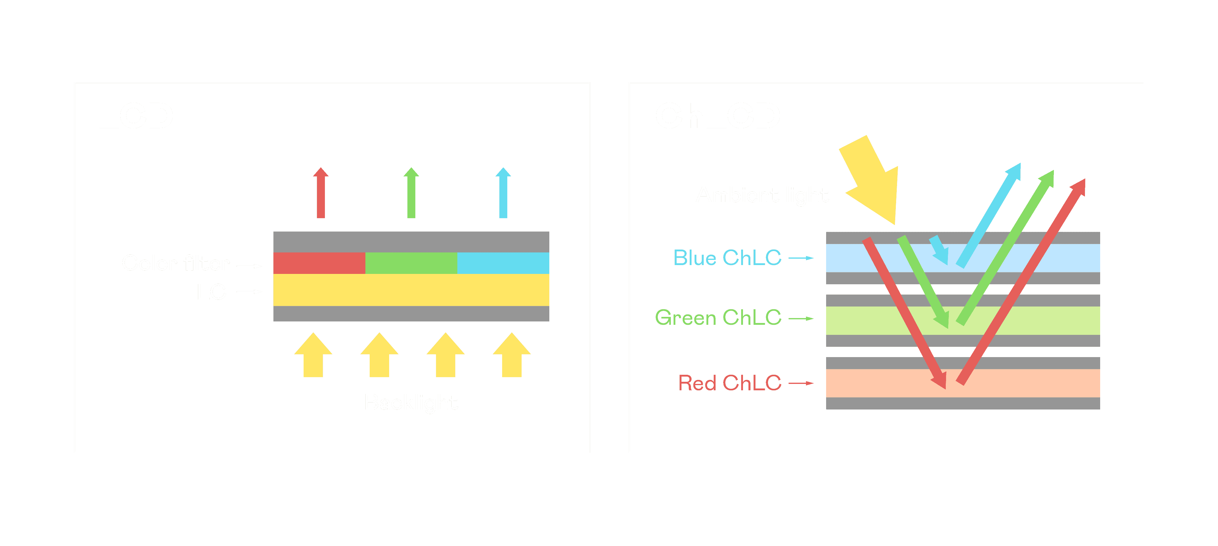 森林舞会胆固醇液晶显示器是由红、、绿、、、蓝三层胆固醇液晶面板堆叠而成,,,,并采用无彩色滤光片设计,,减少环境光在反射过程中的损耗。。